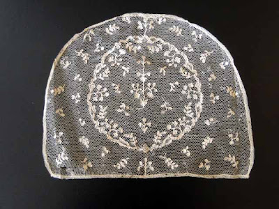 EARLY ARGENTAN LACE CAPBACK.Circa mid to late 1700's, a early Argentan lace capback. Tiny florals and garlands around the inner design with scattered small floral decorations.In mainly strong good condition, there is one openings at the bottom.(Item #AL215)