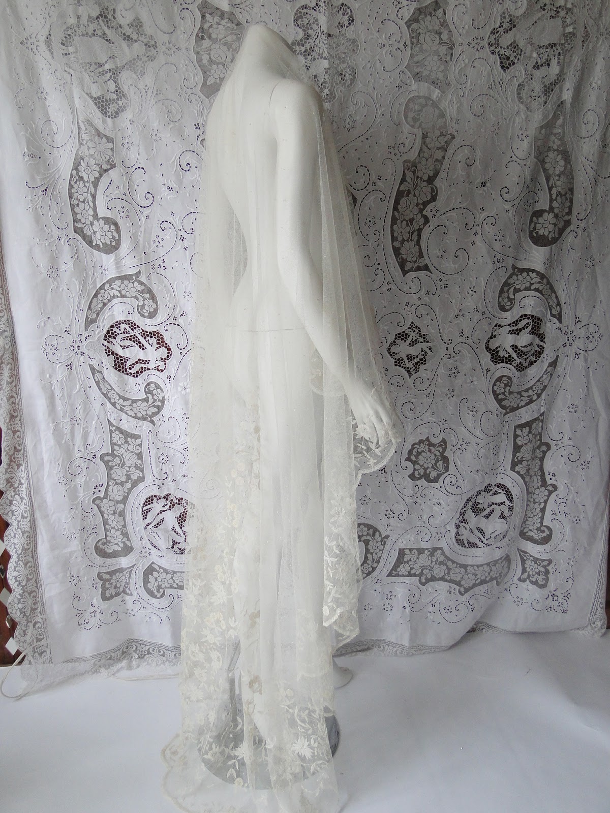 CIRCA 1900,ELEGANT BRUSSELS LACE OVAL WEDDING VEILA fine Brussels Princess lace wedding veil with original patina measuring APPRX..95-98" by 76" at widest part. This veil has very good fine net ,the ornate design of florals and leaves on the train measure apprx.42" deep and the design around all the scalloped edges are apprx.10" along bottom and then gradually tapering to apprx.6" and 3" at the top.Throughout the veil there is scattered Point De Esprit. In all a very good fine elegant shawl. good workmanship and fine design.A few tiny dot pinholes,MINOR, This veil seems as if it was only used once.In very good strong condition.(Item #AL505)