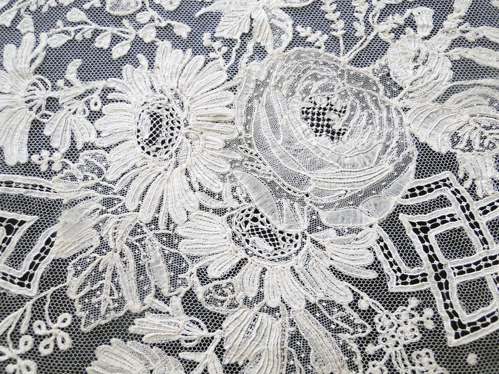 SUPERB BRUSSELS'POINT D'ANGLETERRE" LACE FLOUNCE W/ROSES,HYDRANGEAS. Circa 1850-60's a very beautiful Brussels lace mixed Needle and Bobbin lace flounce measuring a incredible 10 yards ! Measuring apprx 360" by 22".. in centimeters 914.4cm by 55.8cm. The design is opulent with lavish large roses, hydrangeas,petunias,daisies, morning glories, undulating floral and leaf swags and acanthus leaves. There are oval vignettes with fine detailed needlelace, ornate scrollwork and scattered Point De Esprit throughout the lace flounce.The design is exuberant and sumptuous. The tag attached says Point D'Angleterre".The lace is in very good condition, there are a few breaks in the ground but lace seems rarely used. A beautiful design and quality workmanship.(Item #AL605)
