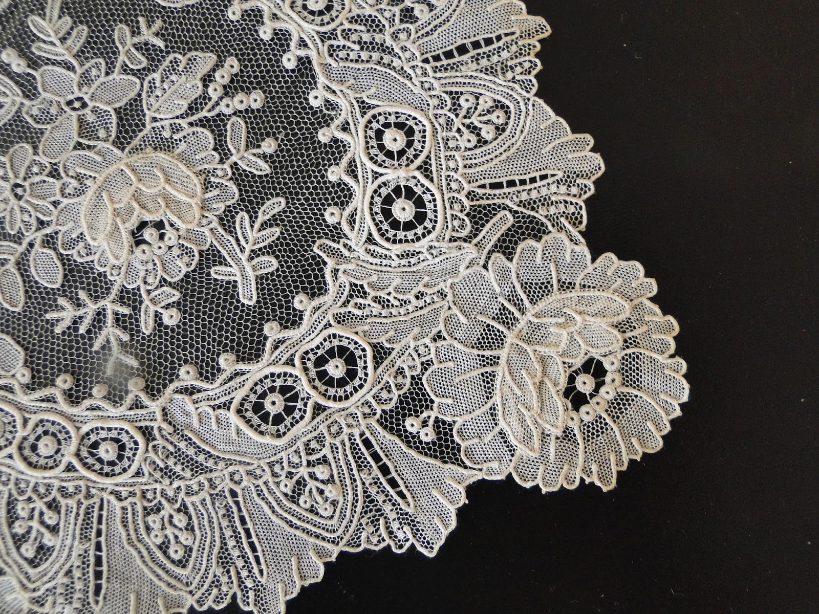 CIRCA 19THC. SUPERB BRUSSELS POINT DE GAZE LACE HANDKERCHIEF. Superior design and workmanship on this ornate Brussels Point de Gaze lace handkerchief. The design has three dimensional roses ,fine Needle lace fillings and elaborate scrollwork throughout the lace. Measuring apprx almost 14". This handkerchief seems to be unused and is in very good condition with it's original patina. (Item #AL608)