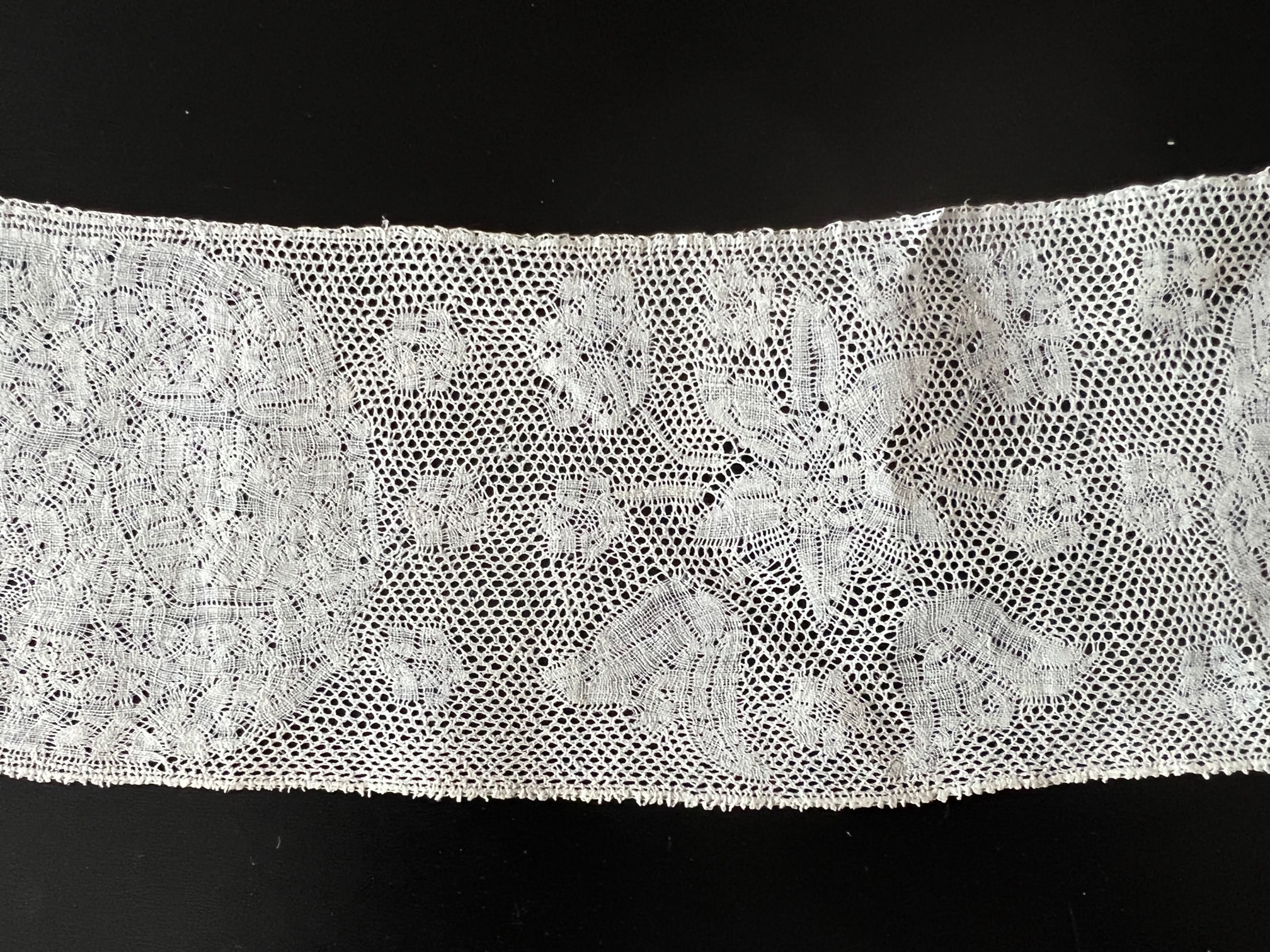 CIRCA 17THC. FINE FLEMISH LACE BORDER. Circa 1670's, a Flemish lace border measuring approx.11" by 3" wide. The lace has a straight border with Point de Paris or Kat stitch ground.A great border for the early lace collector. In mainly good strong condition.The lace is of course very light in the hand, photographs can never fully capture the true beauty of these fine early laces.Early bobbin laces were usually made with the very finest linen flax thread and due to climatic changes over the centuries linen flax became coarser. This thread is of course superb.