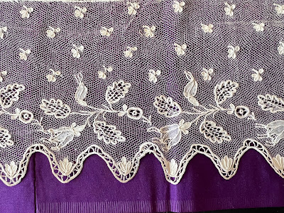 CIRCA 18THC. FINE ARGENTAN LACE BORDER. I love the design on this wonderful Argentan lace. The lace has such a elegant and yet delicate playful design. There are deep scallops, a meandering vines with lovely flowers and leaves and tiny small florets.In very good condition, some slight damage on heading. The lace has it's original cream patina.