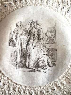 CIRCA 1880-1900's, UNUSUAL COASTERS WITH FIGURAL DESIGNS. A set of seven coasters or placemats with different designs depicting life in the 18-19THC. There are woman and children, merchants offering goods to customers in period dress, images of families with young children playing, men on horseback, families enjoying pastoral scenes etc. The coasters have hand made edgings.Measuring approx.7". In good strong condition, seem unused, a few small scattered storage spots the back and a couple have small spots on front which are minor. These are unused.