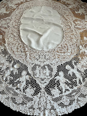CIRCA 1900, ELABORATE FIGURAL OVAL NEEDLELACE TABLECLOTH W/CHERUBS, CHARIOT. A  stunning large  oval Italian Needle Lace tablecloth ! The cloth has large heart shapedvignettes  with assorted designs, a gentleman serenading a lady, a woman tilling her garden, a gentleman seeding his garden while the lady tills her garden, a  woman carrying wheat  while the gentleman carries his sickle and finally  a lady and gentleman in their garden watering their flowers. In between these designs there are large scale cherubs that are drawn by goats and filled twith the harvest from the season. A prevalent theme in Italy, that was used in many of their linens was either the celebration of Spring or the times of Harvest.There was a celebration of the changing seasons and the gifts that were given. The design is stunning and the workmanship is excellent on this wonderful tablecloth. Measuring approx.100"-110" by 92"-95". I believe this cloth originally came from the " Fox" estate, a collection of the very best of linens from the estate of the owners of Metro -Goldwyn- Mayer during the golden age of Hollywood. In very good condition.