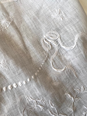 CIRCA 19THC. ETHEREAL LAWN CHRISTENING GOWN W/SWALLOWS,DRAGONFLIES,BOWS.Such a beautiful fine christening gown! The lawn is so very fine, it has a ethereal quality to it that is quite a delight. This is a elegant gown and the quality of whitework embroidery is a testament to it's beauty.The top of the gown has fine Valencienne laces and pintucking and there are three frothy Valencienne lace ruffles around the sleeves. The main part of the gown has a very rare design, there are beautifully worked swallows , Dragonflies ,bows and florals in the design with deep scallops on the edge with Valencienne lace. One can always tell the best of gowns by the quality of linen or lawn and also the quality of the embroiderer.The swallows are so very beautiful! This and a few other gowns we are listing came from a wonderful collection of children's clothes. The lady had impeccable taste! One small opening otherwise in very good strong condition.